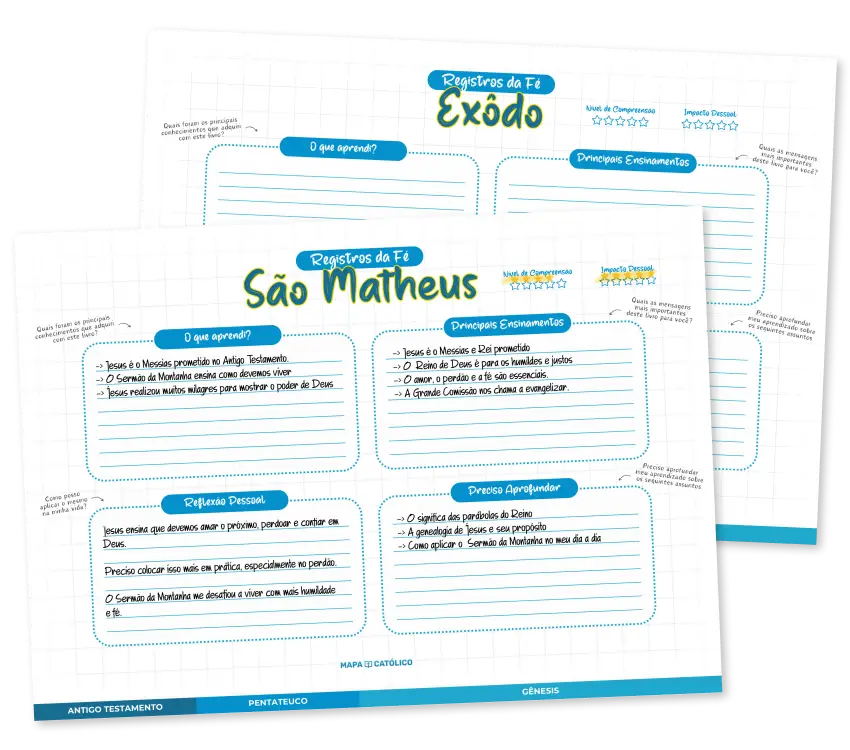 O Mapa da Bíblia são resumos visuais da Bíblia, conforme a tradição católica e a Bíblia Ave Maria, preparando você para explorar e compreender a palavra de Deus em sua totalidade — simplificando a riqueza dos ensinamentos de cada livro sagrado.